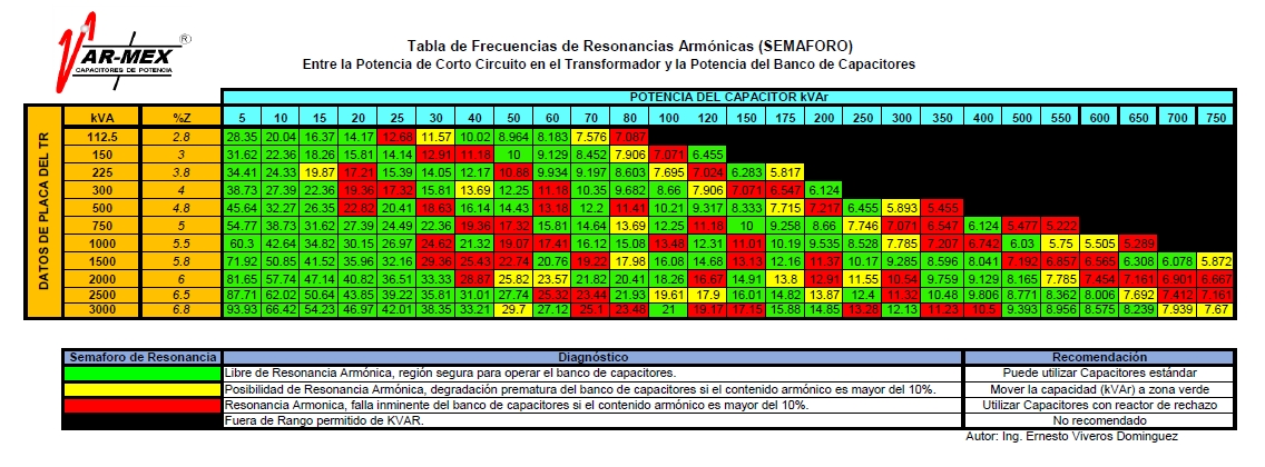 A continuación se muestra el método del “Semáforo de Resonancia” que le ofrecemos como herramienta de visualización rápida de la posibilidad de entrar caer en una frecuencia de Resonancia Armónica por la combinación de Capacitores y el Transformador del Sistema.