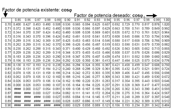 - Obtenga el Factor de conversión de la Tabla 1 donde se interceptan ambos Factores de Potencia escogidos (Existente y Deseado).
