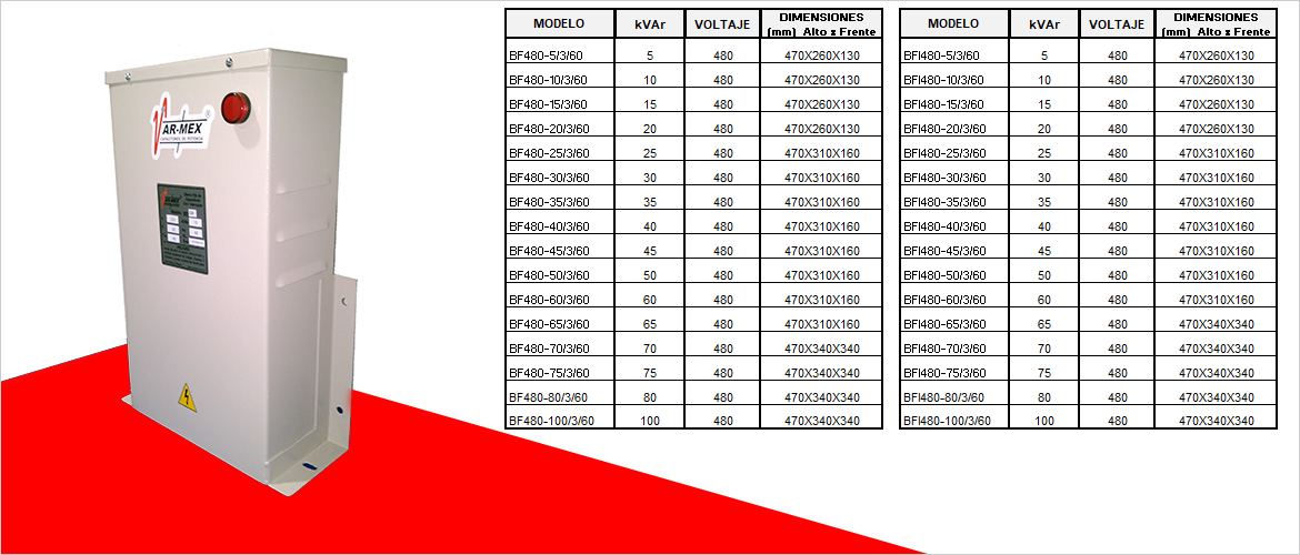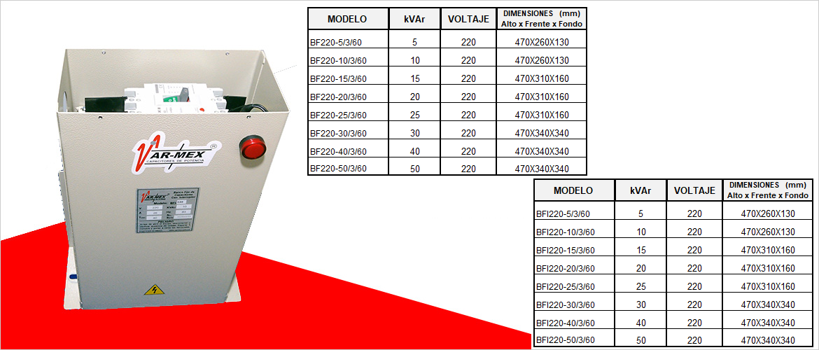 Los Bancos de Capacitores Fijos, marca VAR-MEX, de las Series BF (clema para conexión) y BFI (con interruptor termomagnético integrado), son especialmente utilizados para compensar cargas fijas (Lineales) y transformadores (<10% KVA) en una red eléctrica con un contenido armónico menor al 2% THDv y no mayor al 5% THDi.